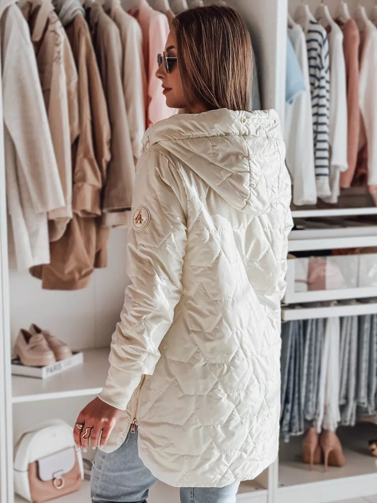 Women's quilted transitional jacket is a great solution for colder days. The model with a non-removable hood, practical zipper and elastic cuffs on the sleeves ensures comfort and convenience. Two external decorative pockets add charm. A great choice for everyday style. Two external pockets. Elastic cuffs on the sleeves