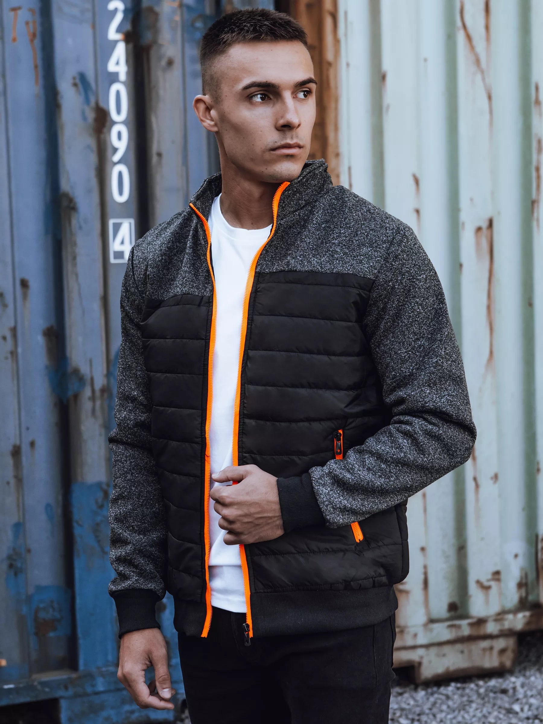 Men's autumn/spring quilted jacket without a hood. The jacket is fastened with a zipper. Two outer pockets with a zipper. The inside of the jacket is lined. The bottom and sleeves are decorated with a drawstring.