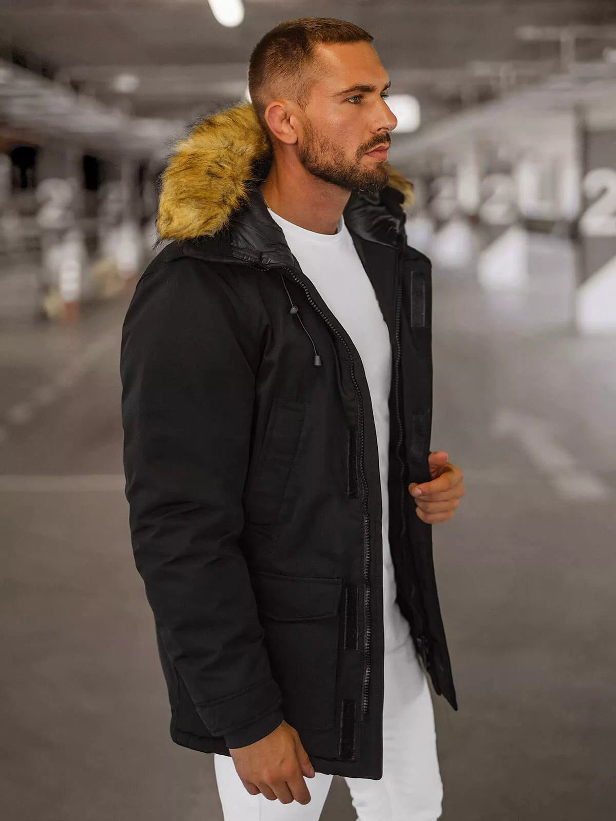 Men's winter jacket with hood, removable fur. High collar. Stylish jacket has zip pockets.