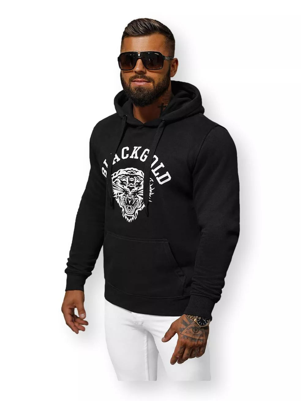 Men's sweater from the latest collection. Model with a hood, kangaroo pocket, fashionable print.