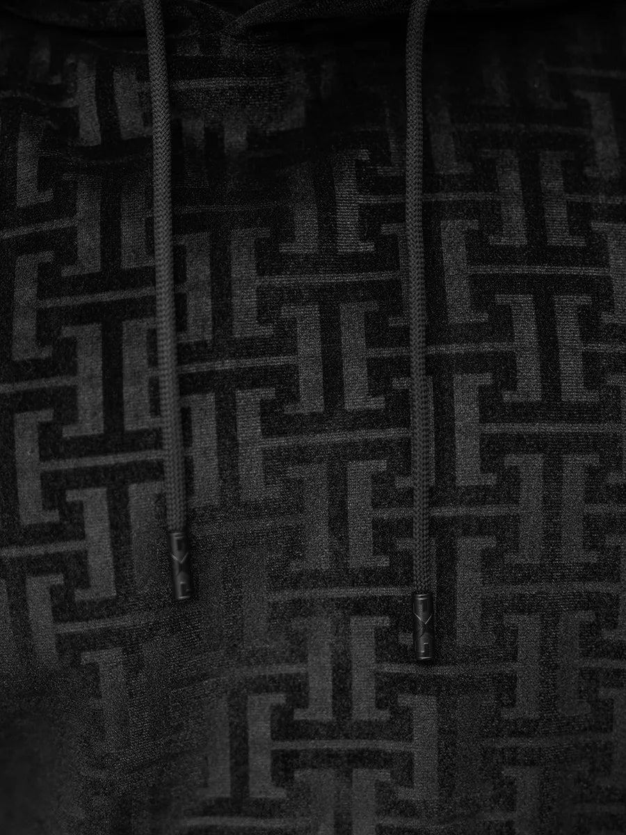 Men's two-piece set, sweater and trousers. Men's hooded sweatshirt with zipper closure and two external zippered pockets. Jogger-style sweatpants.