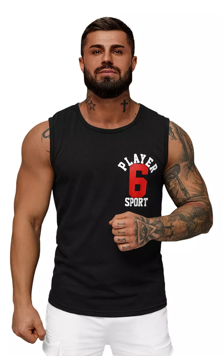 Men's sports tank top "PLAYER 6 SPORT" This stylish men's sports tank top without sleeves is perfect for both active sports and leisure. The inscriptions "PLAYER 6 SPORT" on the front give it a distinctive sporty character. The tank top is made of lightweight, breathable material that ensures comfort even during intense movement. A great choice for training, running or everyday wear.