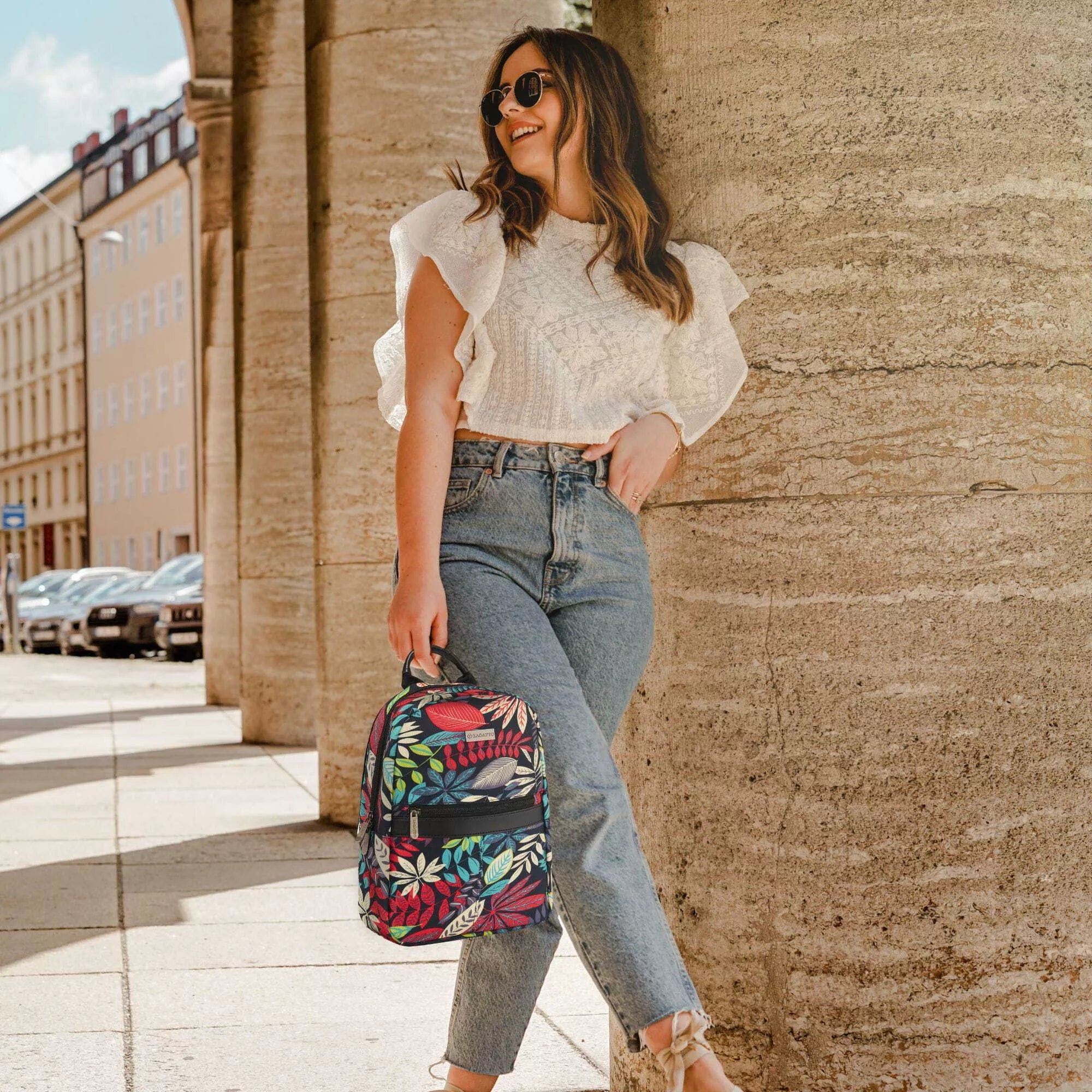 The backpack has a spacious compartment with a larger pocket with an elastic band and a smaller zippered compartment. This makes it easy to organize your belongings. There is another zippered compartment on the front of the backpack.