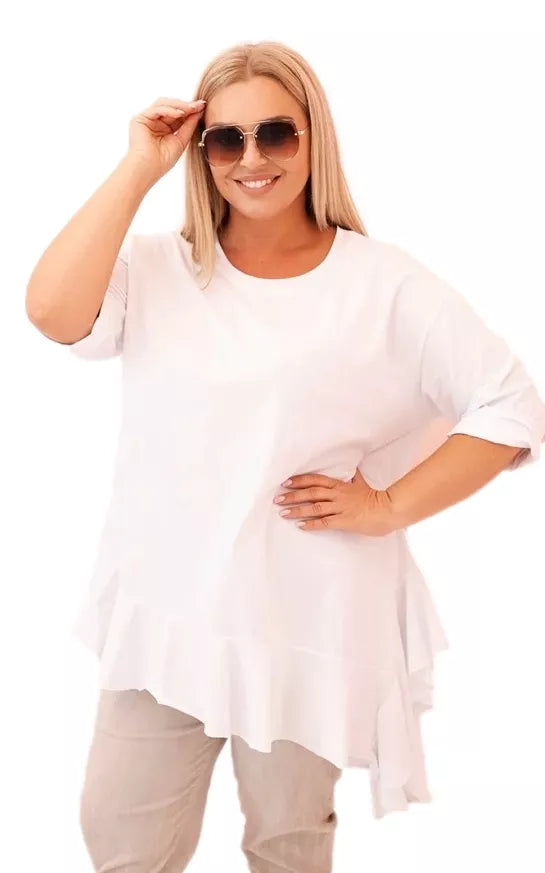 Plus size style – casual and feminineSoft, stretchy cotton with elastaneDecorative ruffle at the bottomAsymmetrical cut gives lightnessSleeves that can be rolled upUniversal style – suitable for various occasions