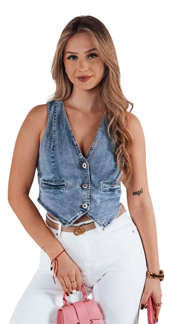 Denim vest with a modern cut that perfectly emphasizes the silhouette. The fitted vest and striking details - decorative pockets and buttons - add style, while the high-quality material ensures comfort when wearing. A great choice for a casual style with a touch of elegance, it goes well with white trousers and sneakers.