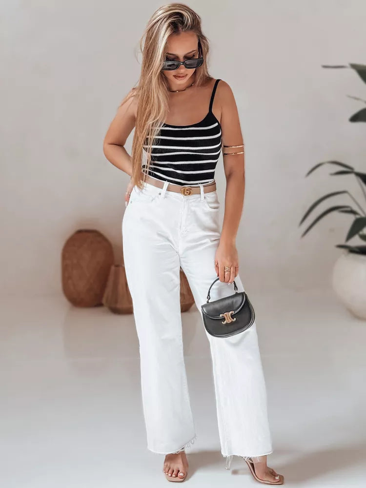Women's ribbed bodysuit with thin straps is a comfortable and stylish choice for warmer days. Horizontal striped patterns optically shape the silhouette. The deep neckline at the back is a subtle accent that gives the whole thing a sensual feel. One size fits all from XS to L. Perfect for spring days and summer styles - both everyday and festive.