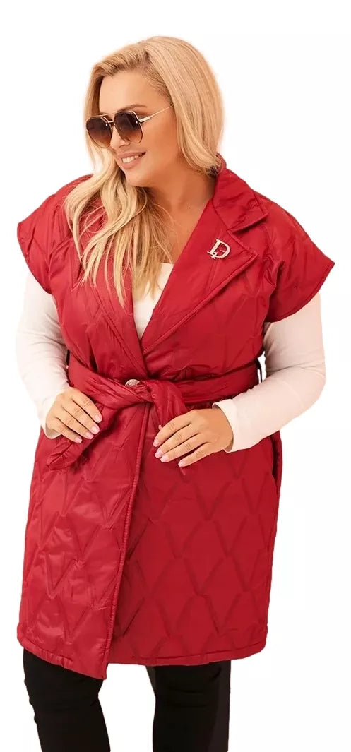 This stylish, quilted women's waistcoat with belt is perfect for women who value elegance and comfort. This model with a classic collar and a decorative D-shaped buckle beautifully emphasizes the silhouette thanks to the attached belt, which can be adjusted at the waist. The quilted fabric with a geometric pattern adds modernity, and the knee-length length provides protection and comfort on colder days. This waistcoat is perfect for both urban and more elegant outfits - combined with golf, a shirt or a sweater. Its cut is suitable for sizes XL, 2XL and 3XL , emphasizing the features of the figure and providing freedom of movement. The size is universal and will suit women wearing sizes XL, 2XL or 3XL.