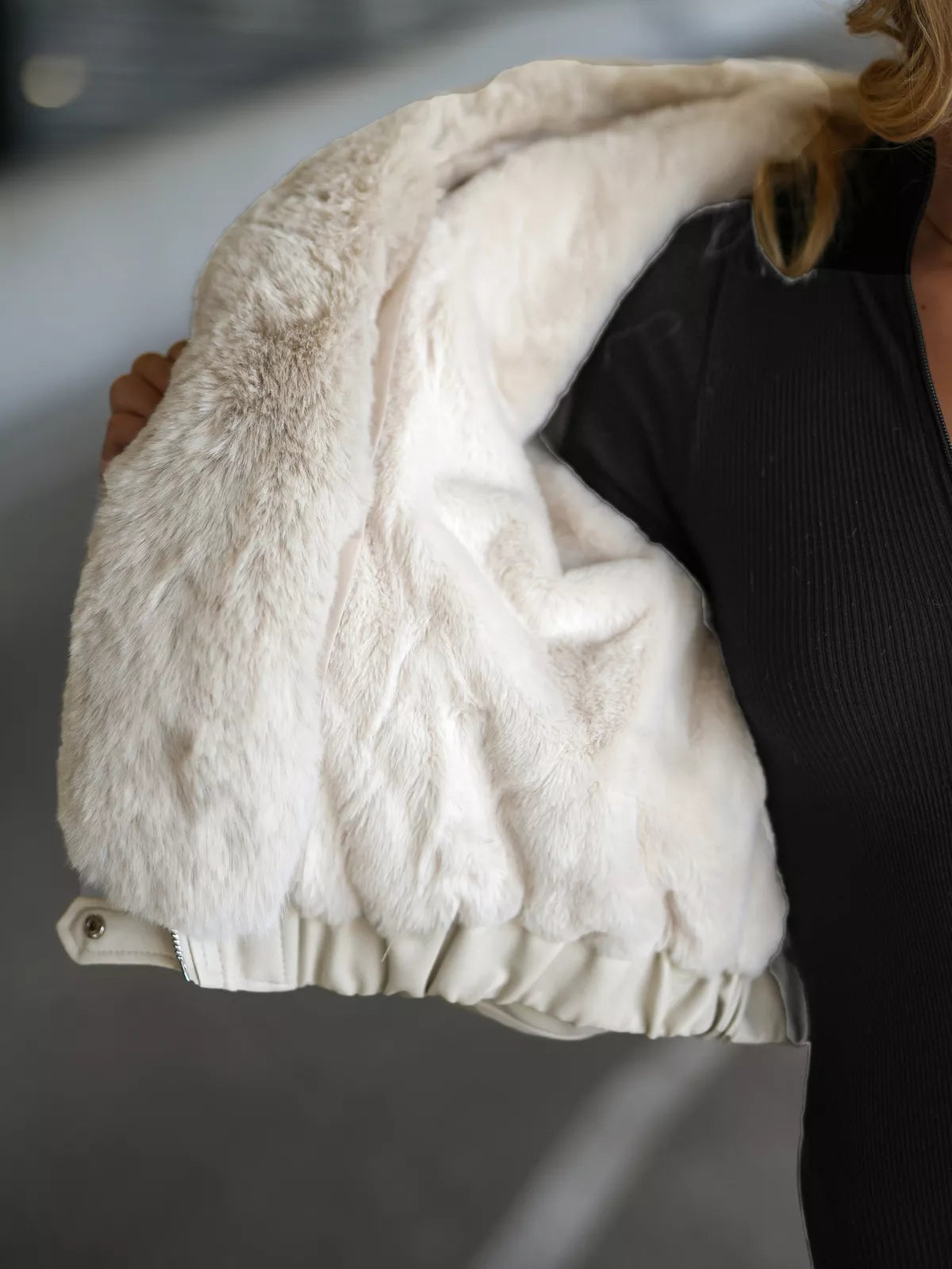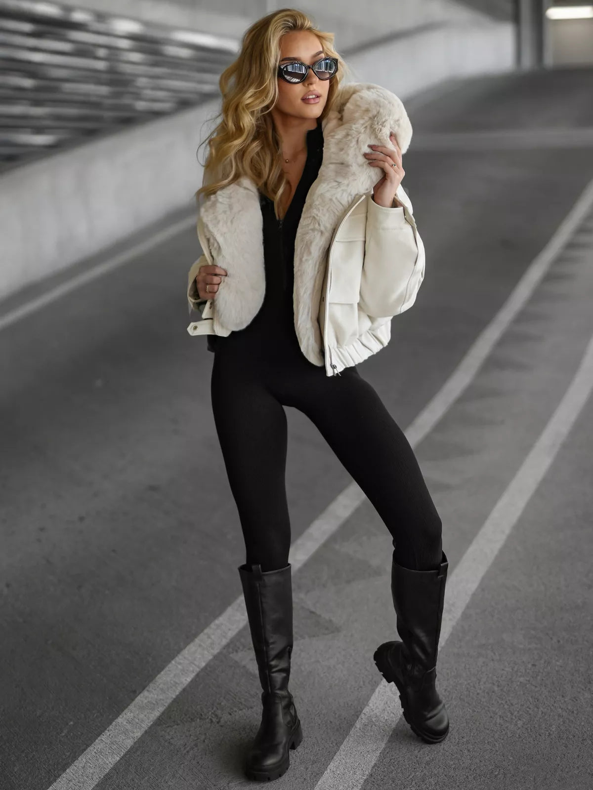 This uniquely designed jacket perfectly combines modern fashion and practicality. Made of high-quality eco-leather, it looks stylish and luxurious, and the warm padded material inside and abundant brown faux fur ensure comfort and protection from the cold. The fur is removable. There are pockets on the sides. A shorter, bomber-style model with an elastic waist highlights the silhouette, while convenient pockets and a sturdy zipper provide functionality.