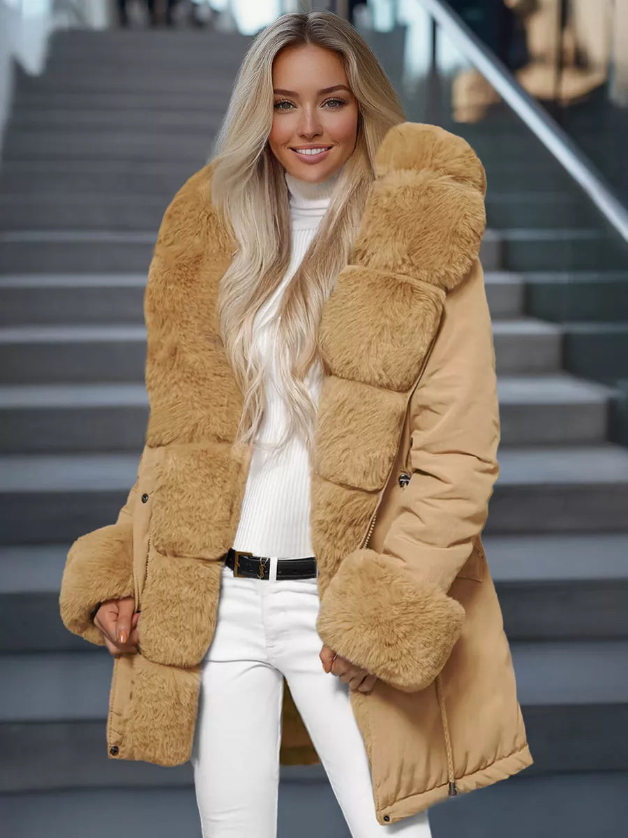 A gorgeous women's jacket with fur on the cuffs and hood. The jacket has a drawstring at the waist to adjust its looseness. There are also pockets on the sides that close with press studs.