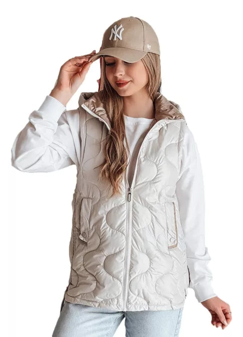A stylish transitional vest with unique quilting that adds character. The filling provides lightness and warmth, and the adjustable sides allow you to customize the vest individually. This model has a removable hood and decorative pockets for small items. Perfect for layering in the transitional season.