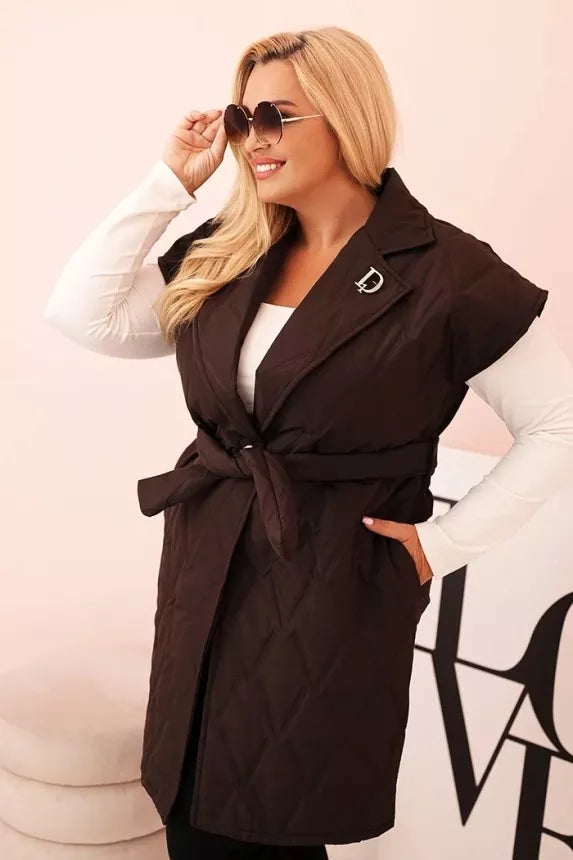 This stylish, quilted women's waistcoat with belt is perfect for women who value elegance and comfort. This model with a classic collar and a decorative D-shaped buckle beautifully emphasizes the silhouette thanks to the attached belt, which can be adjusted at the waist. The quilted fabric with a geometric pattern adds modernity, and the knee-length length provides protection and comfort on colder days. This waistcoat is perfect for both urban and more elegant outfits - combined with golf, a shirt or a sweater. Its cut is suitable for sizes XL, 2XL and 3XL , emphasizing the features of the figure and providing freedom of movement. The size is universal and will suit women wearing sizes XL, 2XL or 3XL.