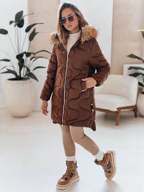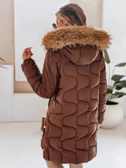 A warm quilted jacket with a large hood, trimmed with faux fur, is a must-have for the winter season. Its slightly tight cut, decorative seams and double zipper for a better fit are perfect for both walks and winter shopping in the city. It protects against wind and cold. The hood of this jacket is not removable, there are two external pockets, one internal.