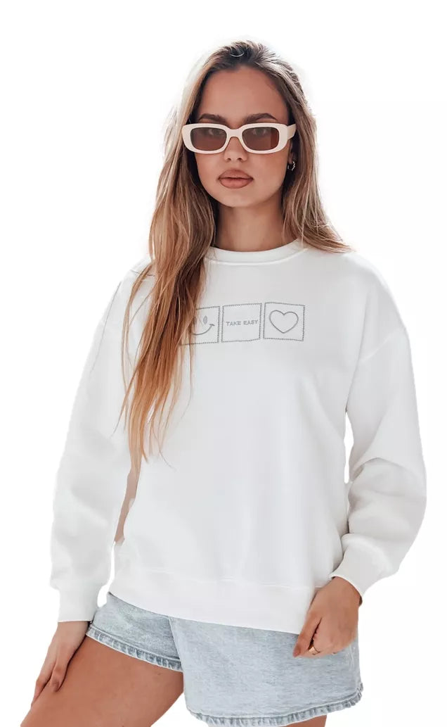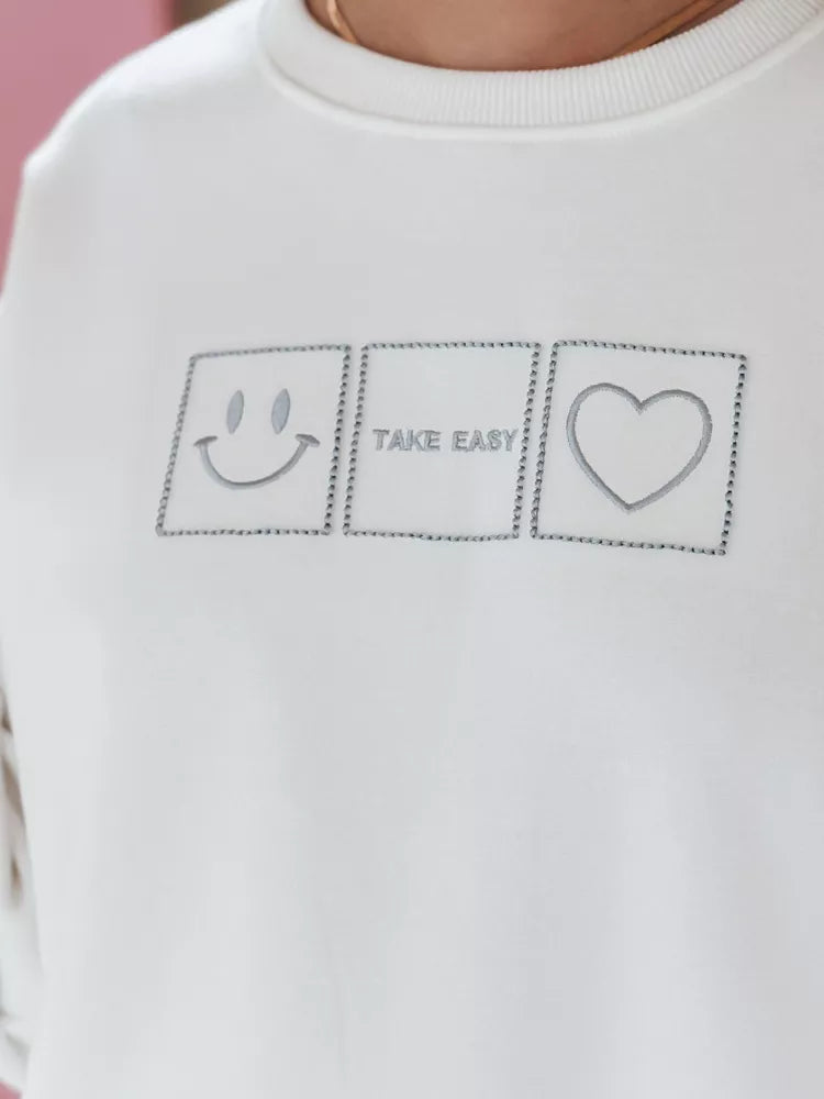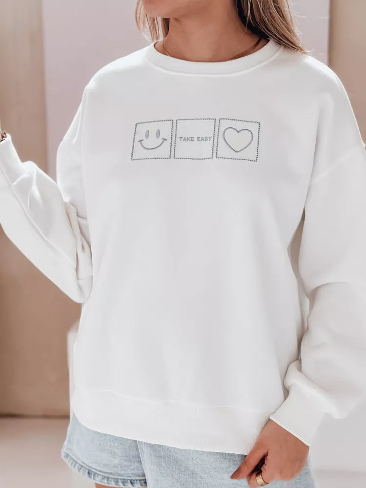 Women's sweater with embroidered motifs: a smile, a heart and the inscription "TAKE EASY". Comfortable sweater with a round neckline and elastic cuffs on the sleeves and bottom. One size fits all from XS to L. Soft material ensures comfort for everyday wear. A great choice for spring days when comfort and style are the most important.