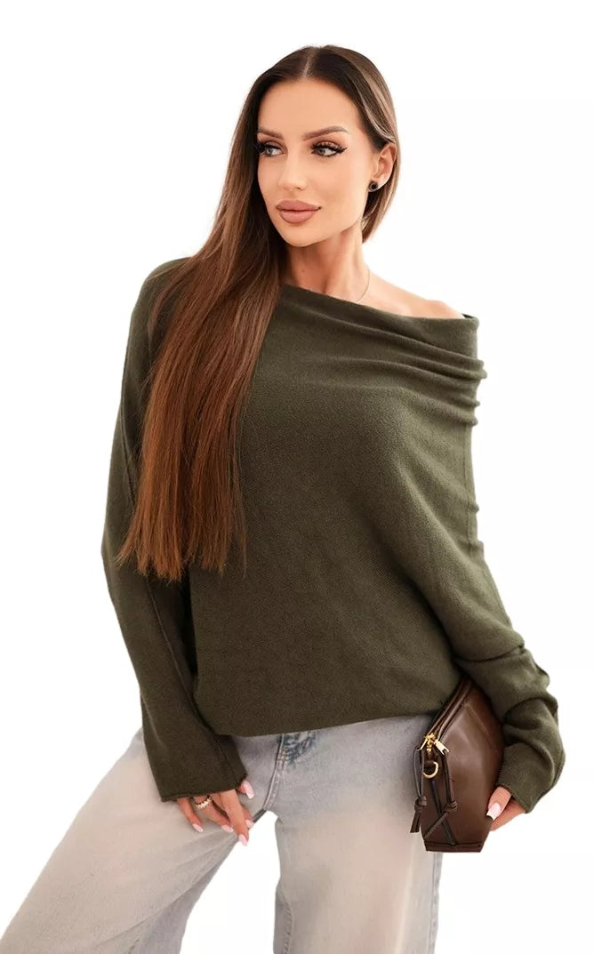 This women's asymmetrical batwing sweater is a fashionable choice that goes well with both casual and elegant outfits. The loose, oversized cut ensures comfort and freedom of movement, while the distinctive batwing cut with asymmetrical hem gives the garment a unique and modern look.