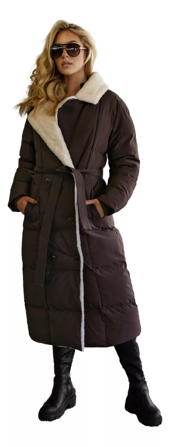 Elegant women's long winter coat in chocolate brown. The coat is quilted, ensuring warmth and comfort in the cold season. Long model to the calves, warm, puffy quilted fabric. Contrasting light faux fur flap and interior trim. Fastens with buttons and additionally tied with a belt, emphasizing the waist. Two convenient side pockets
