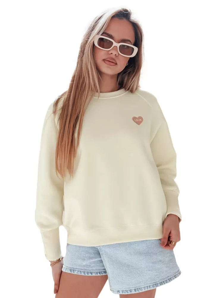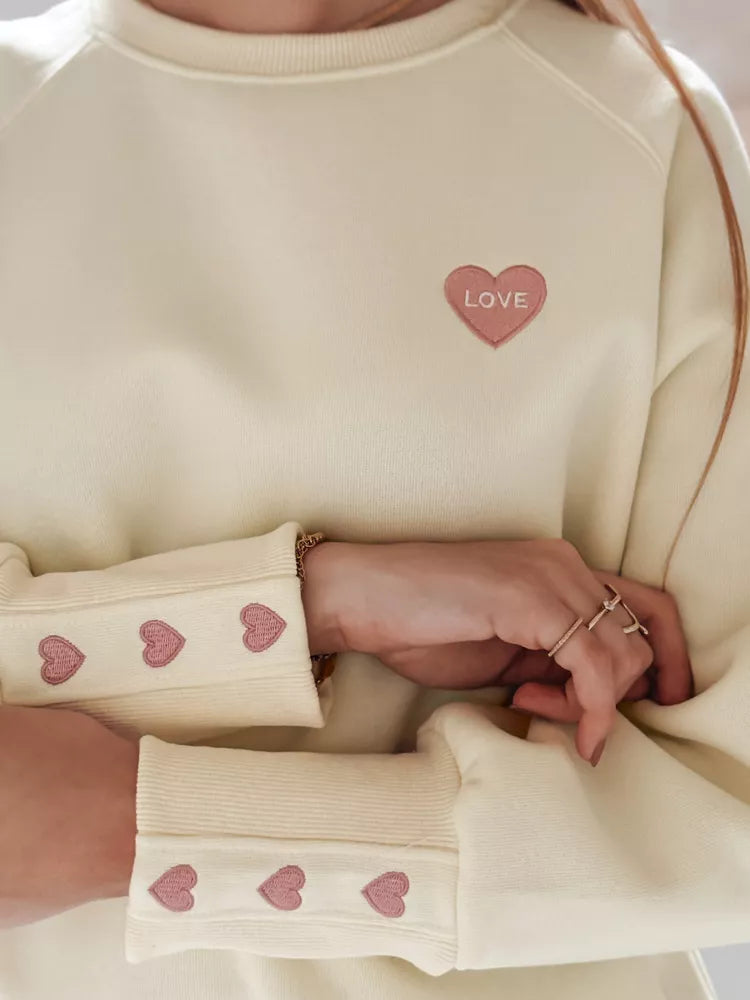 Women's sweater with decorative heart embroidery and the inscription "LOVE" on the chest and cute hearts on the sleeves. Sweater model, without a hood, with a round collar and elastic cuffs. Universal size fits from XS to L. Soft material ensures comfort of wearing. Perfect spring style offer.