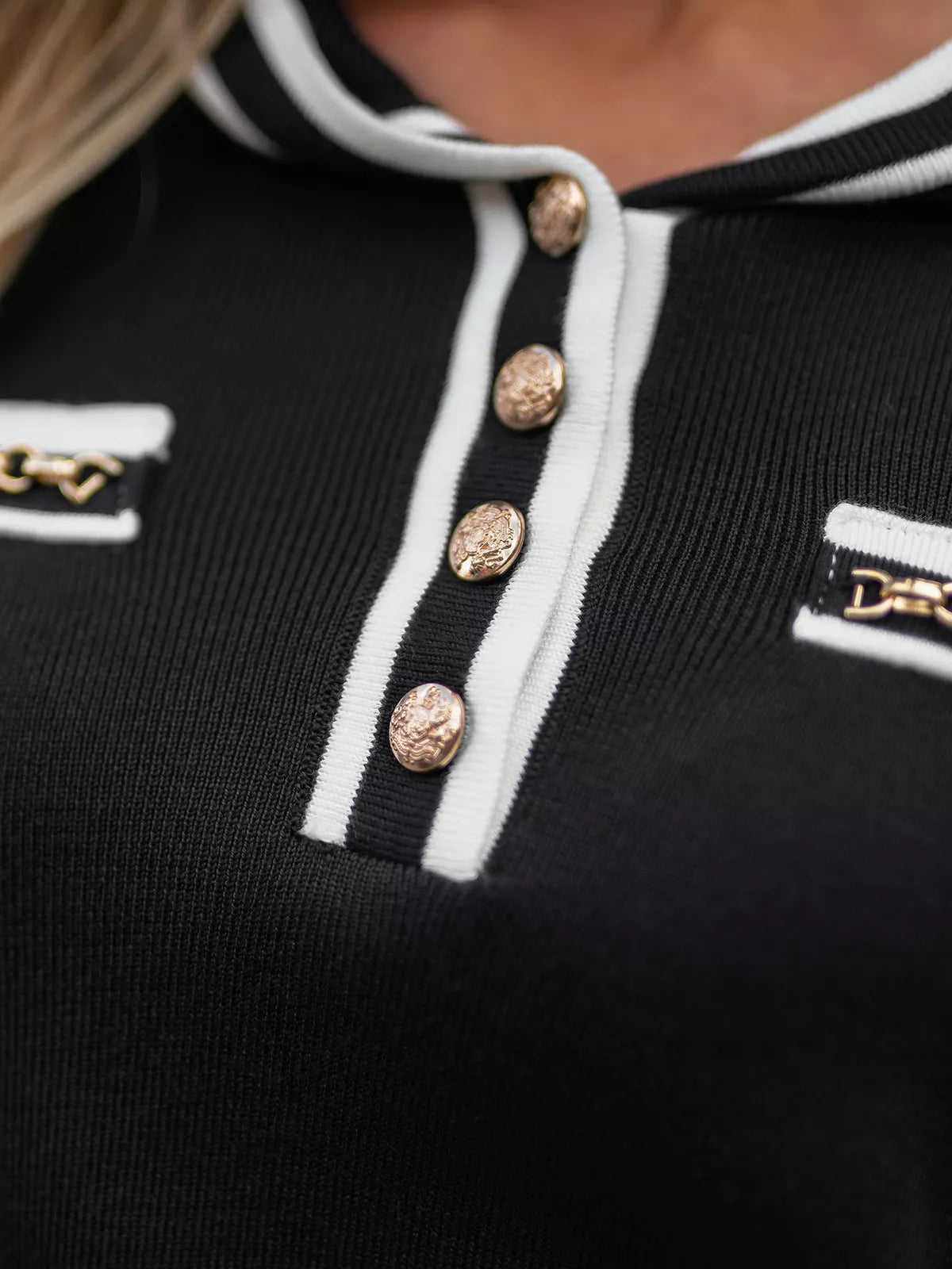 Women's two-piece casual suit in black with subtle white accents. The set includes a long-sleeved jumper and wide-leg trousers. The long-sleeved jumper is loose-fitting and decorated with a white trim along the collar and button placket. It features a multi-button fastening at the front and a decorative appliqué with lettering on the chest. The trousers are black, wide-legged, with a comfortable elastic waistband and drawstring. Style: casual, sporty, modern, suitable for everyday wear, travel, or active leisure.