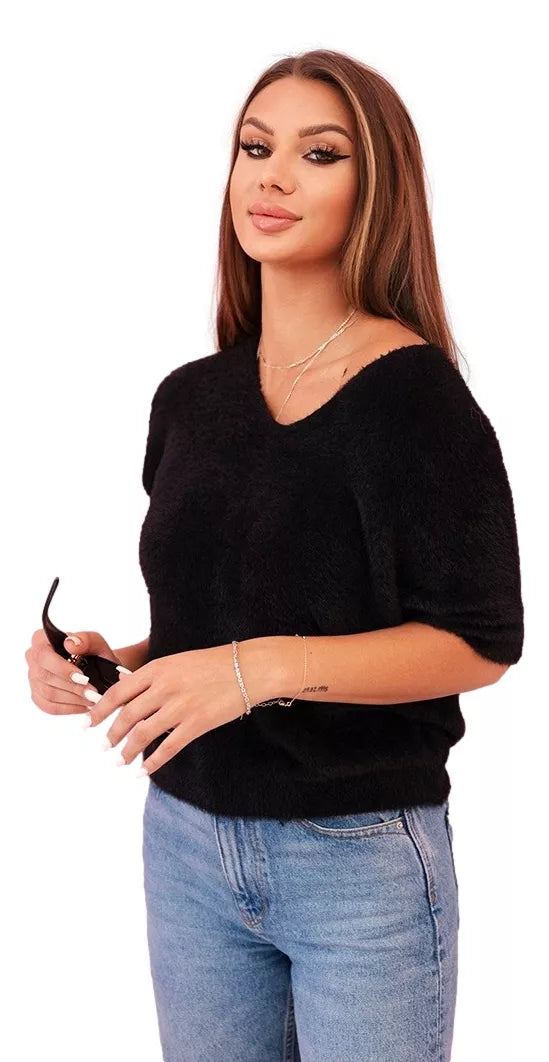 This women's sweater, made of incredibly soft, fluffy fabric, is perfect for women who value comfort and a fashionable look. The delicate fluff provides comfort, and the V-neckline subtly slims the silhouette. The shorter sleeves are perfect for warmer days or as part of a multi-layered outfit. The sweater is stretchy, adapts to the body and provides complete comfort. It is perfect for both everyday style and more elegant outfits. The size is universal and will fit women size S, M or L.