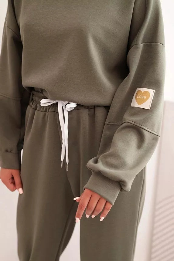 This elegant women's set, made from soft, stretchy viscose with polyester and elastane, is a perfect choice for women who value comfort and stylish looks. The loose-fitting jumper features a longer back and dropped shoulders, and a charming LOVE detail on the sleeves adds a unique touch. The trousers with an elastic waistband and drawstring fit perfectly to the figure, while the ribbed cuffs add a sporty feel. This set is perfect for everyday style, whether it's for walks, travel, or relaxing at home. Due to its dimensions, it fits women wearing sizes L to XXL.