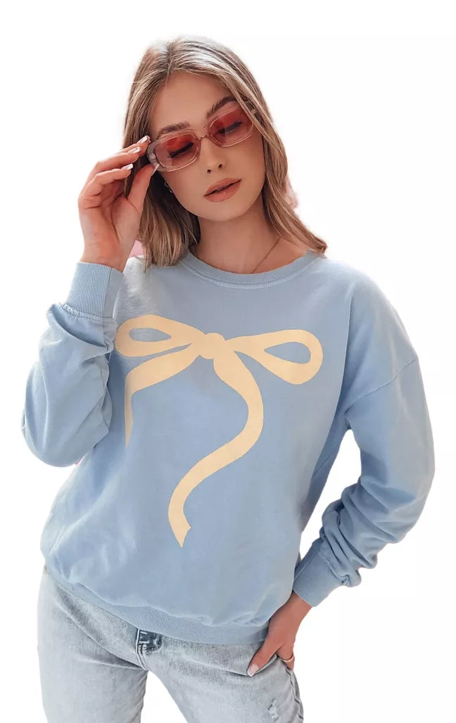 Women's sweater with a charming ribbon pattern that adds a girly charm to any style. Made of soft, breathable fabric, it ensures comfort all day long. The classic cut with a round neckline and cuffs on the sleeves fits perfectly to the figure. One size fits all from XS to L. Perfect for everyday wear.