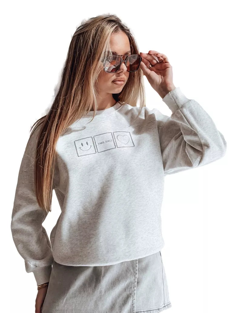 Women's sweater with embroidered motifs: a smile, a heart and the inscription "TAKE EASY". Comfortable sweater with a round neckline and elastic cuffs on the sleeves and bottom. One size fits all from XS to L. Soft material ensures comfort for everyday wear. A great choice for spring days when comfort and style are the most important.
