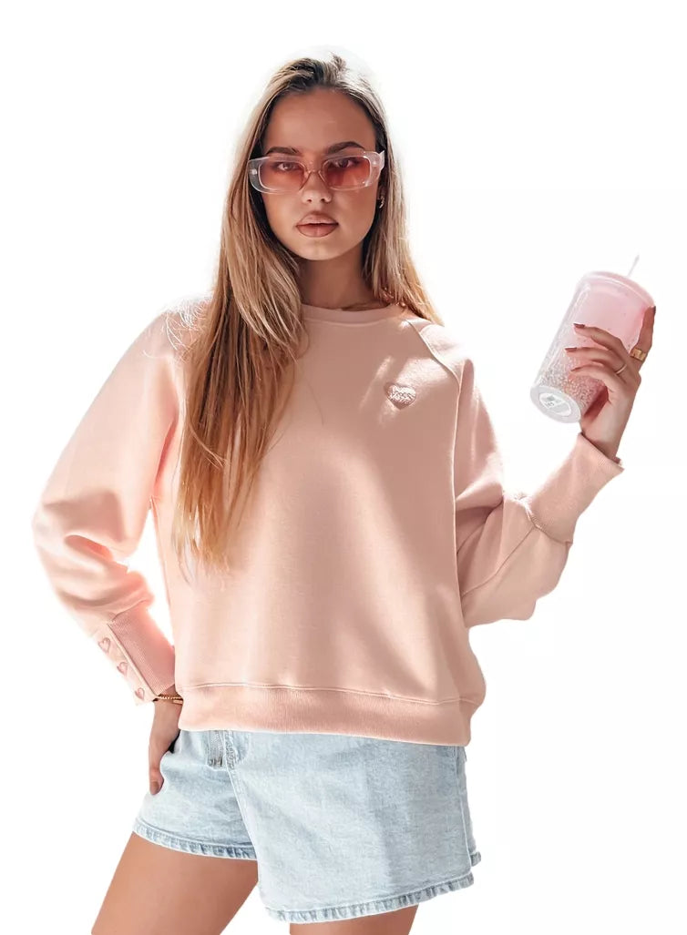 Women's sweater with decorative heart embroidery and the inscription "LOVE" on the chest and cute hearts on the sleeves. Sweater model, without a hood, with a round collar and elastic cuffs. Universal size fits from XS to L. Soft material ensures comfort of wearing. Perfect spring style offer.