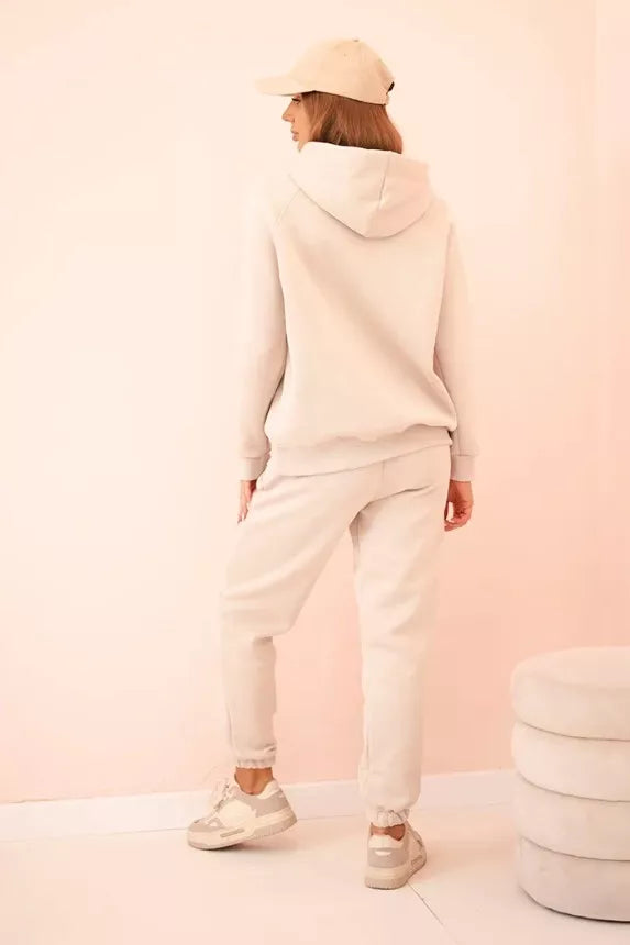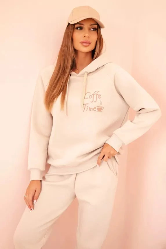 This women's insulated tracksuit is perfect for cooler days. Made from a soft, pleasant-to-touch material, it ensures maximum comfort at home, while walking, or during everyday activities. The hooded sweatshirt with the "Coffee Time" inscription adds a casual and relaxed feel to the overall look, while the elastic waistband pants provide a comfortable fit. A stylish and practical set that can be worn together or separately – a great staple for everyday wear or lounging at home. The insulated material guarantees pleasant warmth, and the classic cut allows for comfortable movement.