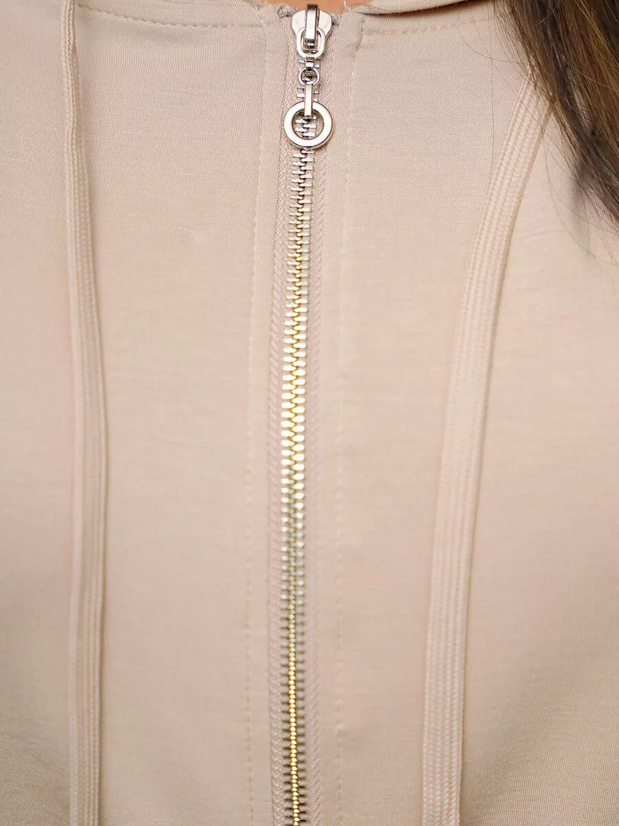 Women's casual set consisting of a hooded zip-up sweatshirt and loose-fitting trousers with side pockets.