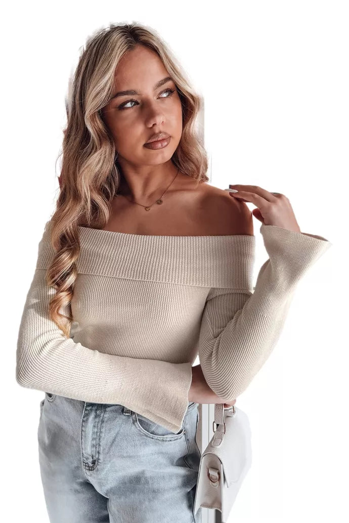 A sweater with a neckline that beautifully exposes the shoulders. The fitted cut highlights the silhouette, and the wide sleeves add elegance. The material is pleasant to the touch, making it a real pleasure to wear. Goes well with jeans or a pencil skirt.