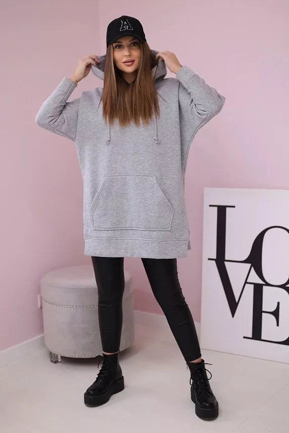 We present to you a warmed sweater. This hooded sweater has side slits. The sweater is made of warmed material. It is one size and fits women wearing sizes S, M or L.