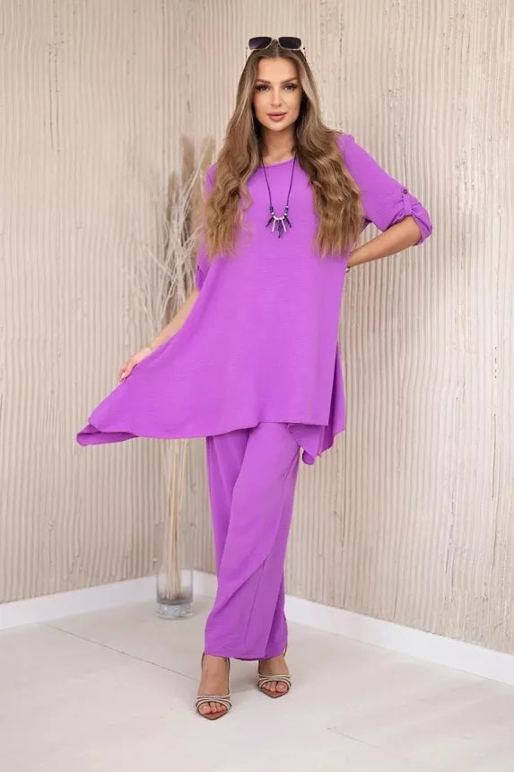 This Italian two-piece set, consisting of a flared blouse and trousers, is an elegant ensemble that adds charm and style to any look. The flared blouse offers subtle femininity, accentuates the figure, and ensures freedom of movement. The classic cut of the trousers perfectly complements the elegant blouse, creating a harmonious and stylish whole. Furthermore, the key-shaped pendant is a charming detail that adds originality and character to this set, creating a harmonious composition. It's an elegant accessory that emphasizes uniqueness and attention to detail throughout the style. This Italian set is perfect for various occasions – from business meetings to romantic dates. It's a sophisticated choice for those who appreciate elegance and comfort in one. The size is universal and fits women wearing sizes S, M, or L.
