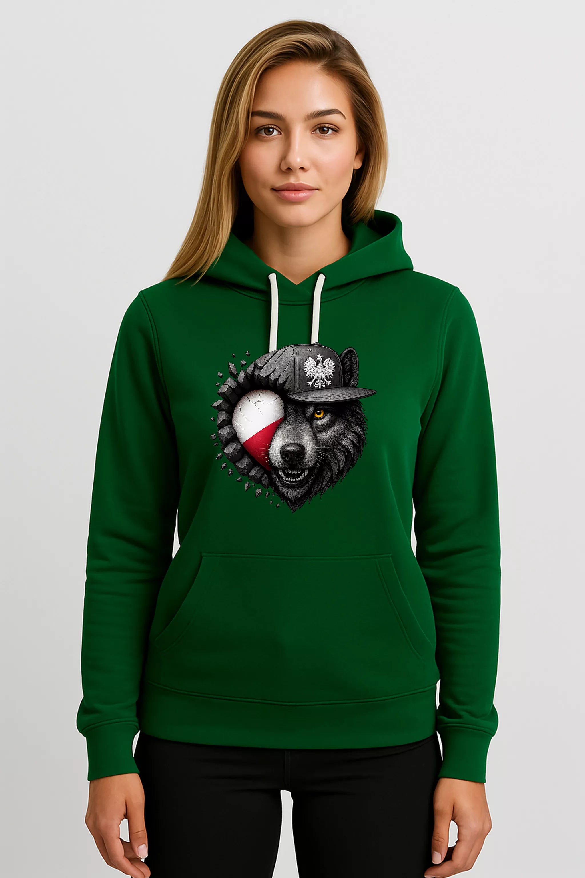 A unique style for those who want to show their strength and national identity! This women's sweatshirt features a powerful image of a wolf emerging from an exploding wall. One of the wolf's eyes represents the Polish flag, while the cap is adorned with a Polish eagle, symbolizing pride in one's country.