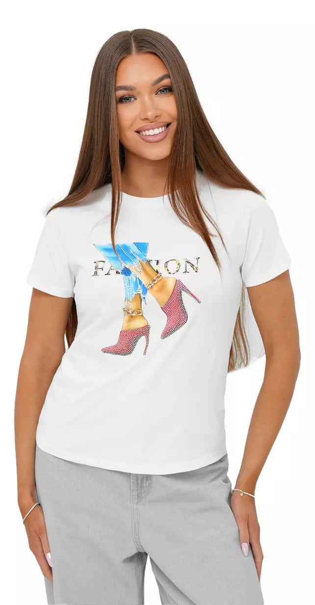 A uniquely designed T-shirt for women with a colorful illustration and a shiny inscription "FASHION". The image with high heels and jeans gives this model a fashionable and bold accent. A great choice for those looking for a combination of style and comfort!