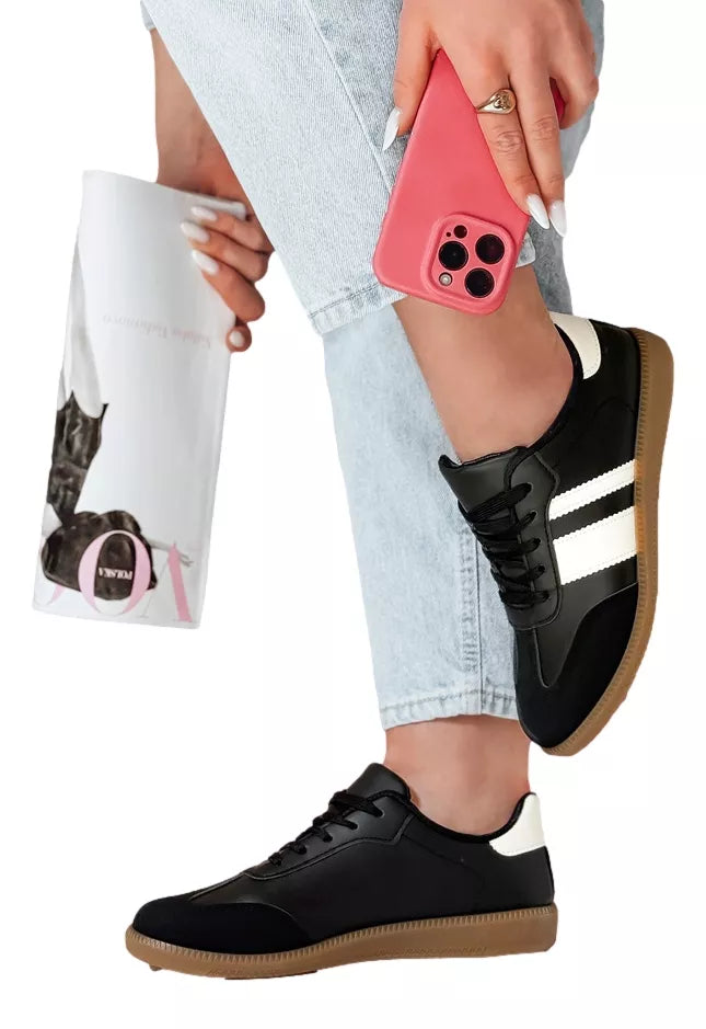 Women's sports sneakers on a flat rubber sole. The model is made of eco-leather and has a fabric insert. Due to its fashionable look, they are perfect for combining with jeans and more casual clothes.