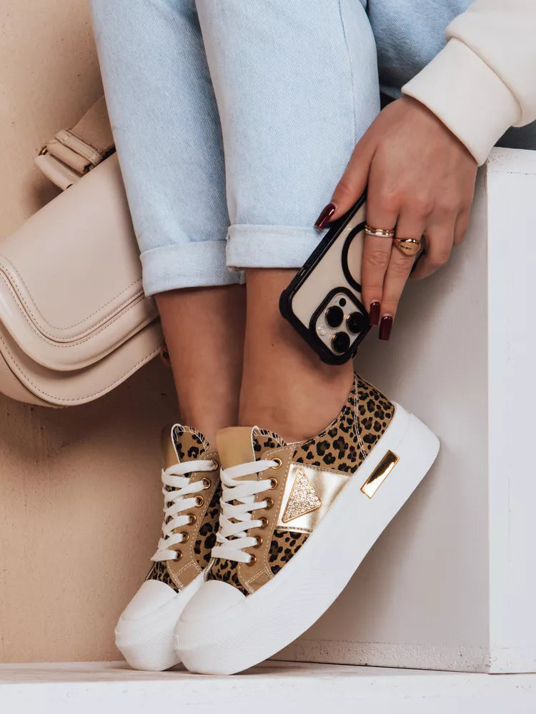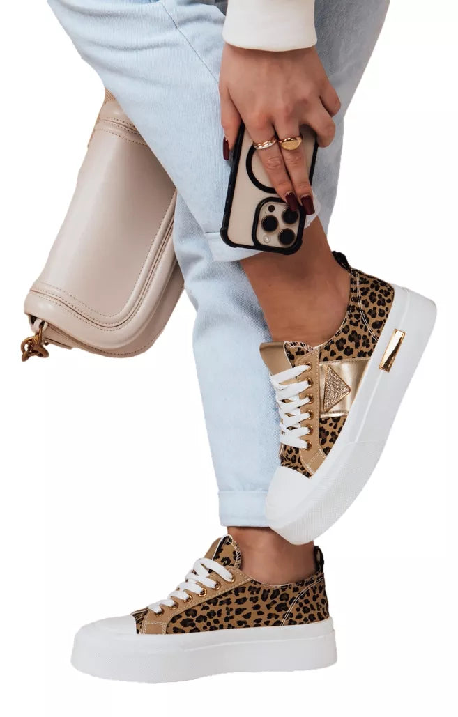 Women's sneakers on a high platform, made of fabric. The upper part is laced up. The shoes have a diamond-shaped decoration, which adds charm and elegance. They go well with both trousers and dresses, making them a universal choice for any occasion.
