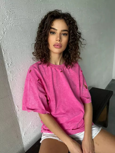 Classic design combined with bold slits, creating a unique accent in your everyday wardrobe. The round neckline will emphasize your neck and add charm to any style. Practical and full of character, AYUBAS T-shirts are designed to express your individuality and self-confidence. Perfect for everyday outings with friends or as an element of a casual urban look.