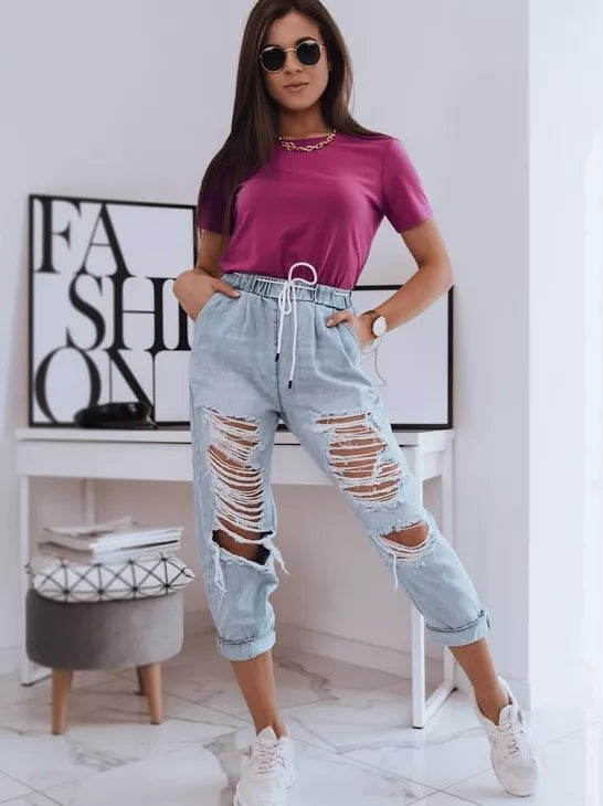 Women's T-shirt from the latest collection, with a round neck. Material: 50% cotton, 50% polyester. Model (183 CM 80 kg) is wearing size L.