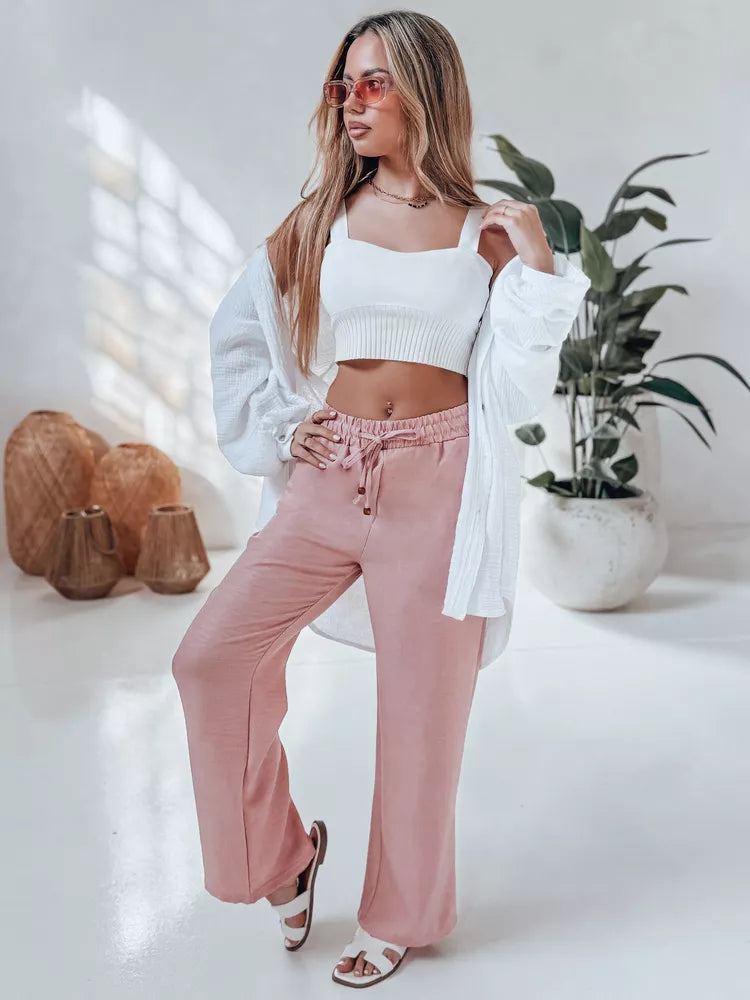 Casual women's trousers with a loose cut and wide legs are a comfortable and fashionable choice for warmer days. The high waist with an elastic band and drawstring allows you to adjust the style to your figure and ensures comfort all day long. Two decorative pockets on the sides emphasize the casual character of the trousers, and the light, breathable material ensures comfort. Perfect for spring and summer styles.