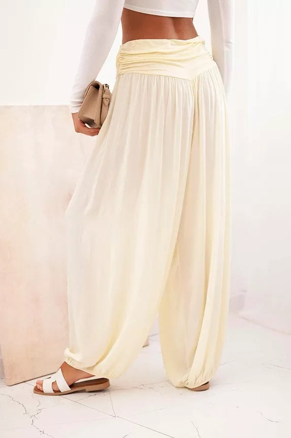 These unique women's wide-leg trousers with subtle ruffles are perfect for everyday wear and more. Made of 100% soft viscose, they are light and comfortable to wear even on warmer days. The elastic waistband ensures comfort and a great fit, while the loose cut allows for freedom of movement and looks fashionable. The elastic cuffs at the bottom of the trousers give the trousers a unique character and subtly accentuate the figure. They are a great choice for walking, shopping, traveling or relaxing at home. The simple design and neutral colors make them easy to combine with various clothing options - from sports to casual. One size fits all, suitable for women of size S, M or L.