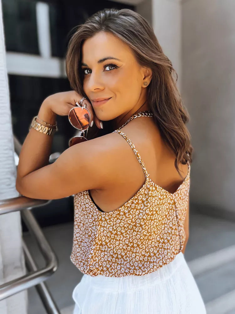 A beautiful blouse with adjustable straps. The unique, floral pattern attracts attention.