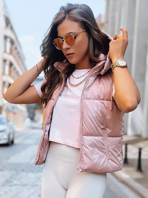 A sporty, cropped vest. The vest has a removable hood, so it will fit many styles. The model is lightly insulated.