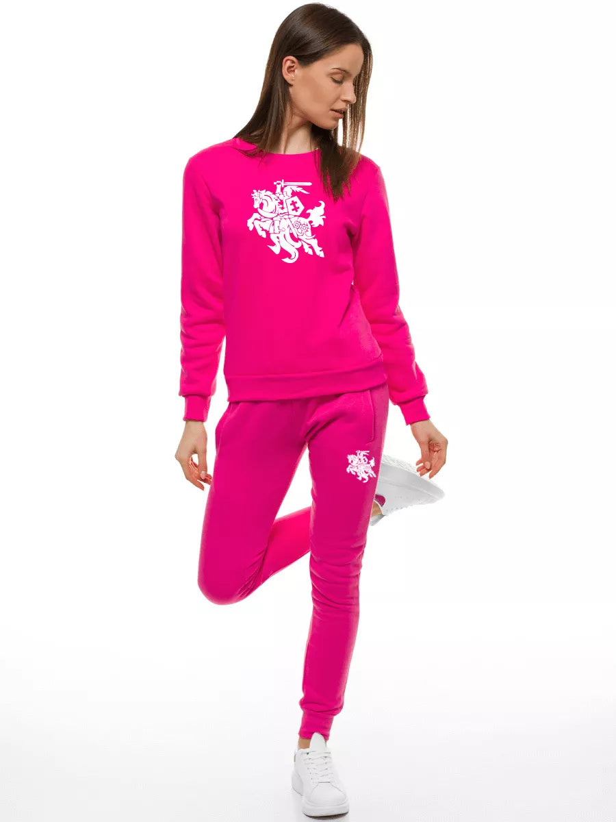 Women's pink tracksuit. Sweater and trousers. Country of origin: Poland. Pants: 65% cotton, 35% polyester. Sweater: 65% cotton, 35% polyester. Possible error +/- 3 cm.