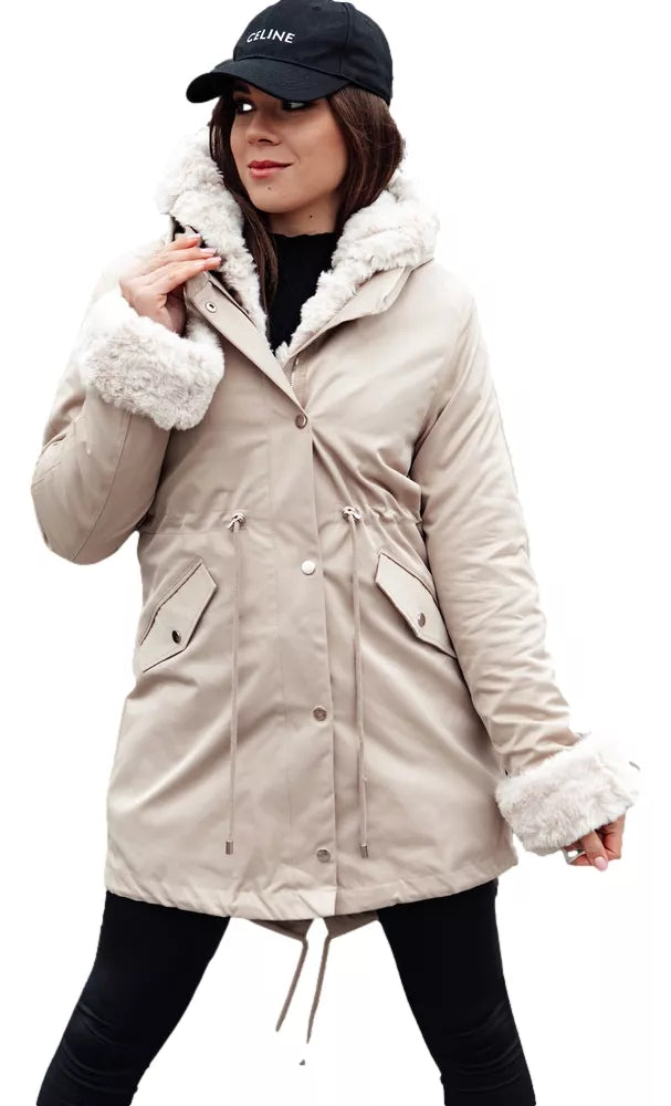 Long women's jacket with a hood and fur trim, the fur lining is removable.