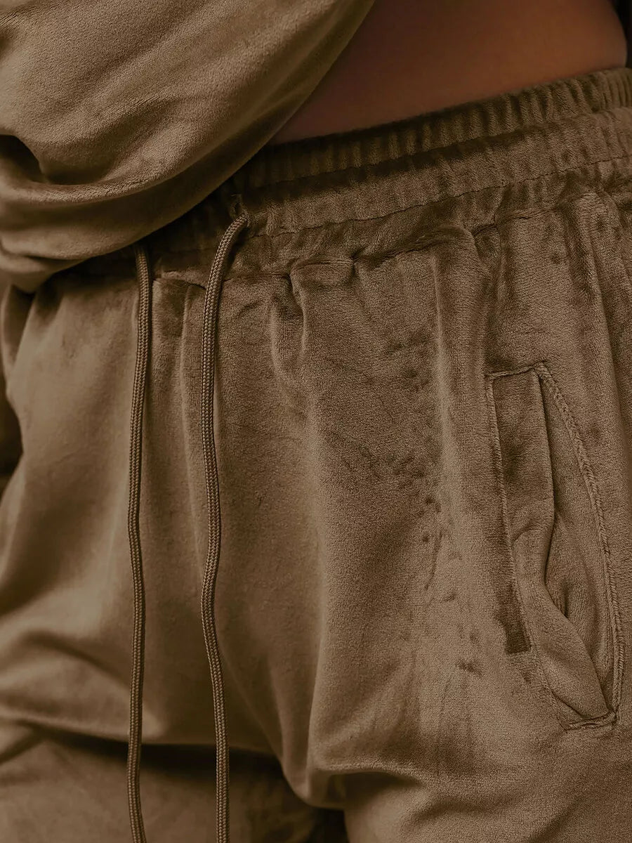 Women's velour tracksuit, perfect for everyday wear. The sweatshirt has a hood and kangaroo pocket, and the trousers have two pockets.