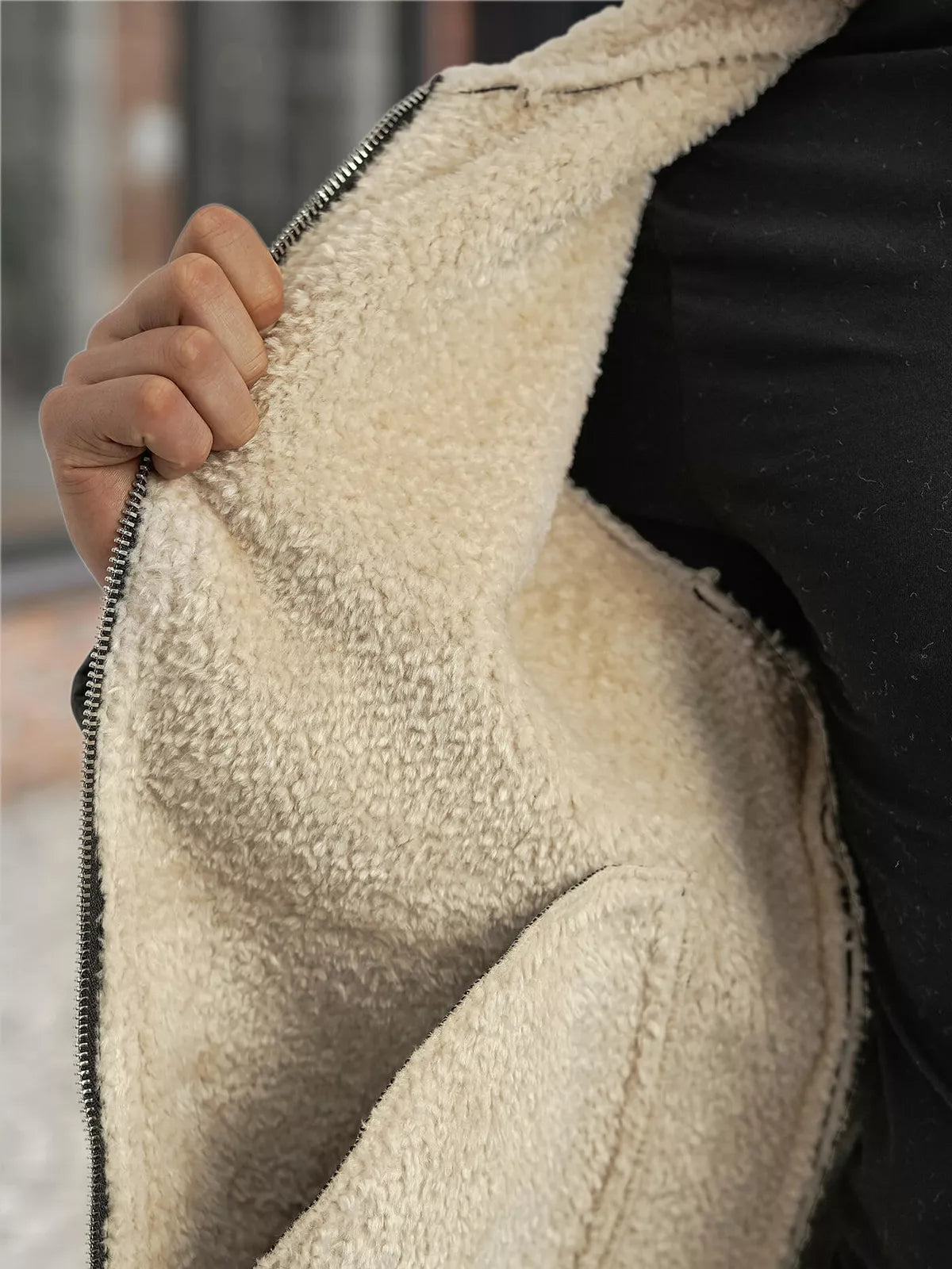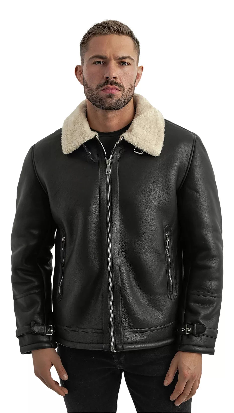 Made of high-quality eco-leather, which looks luxurious and is resistant to wind and moisture. The inside is covered with a soft lining, and a soft fur collar provides extra warmth and exceptional comfort on colder days. Two side pockets with zippers and adjustable straps at the cuffs emphasize practicality and masculine character.