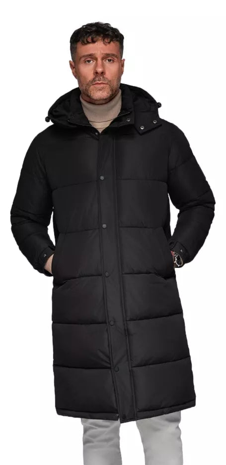Men's long black winter down jacket with a hood is a stylish and practical choice for the cold season. The classic straight silhouette model adds elegance, and the longer cut effectively protects against cold and wind. The jacket features horizontal quilted patterns that help keep heat evenly distributed over the entire surface. It fastens with a zipper and press studs, providing additional protection from the cold. The hood is adjustable with drawstrings, and the roomy pockets on the sides will allow you to conveniently hold your hands or small items. This jacket is perfect for everyday wear, work or leisure, and will go well with both classic and leisure clothing combinations. The black color provides versatility and is easy to combine with various accessories.