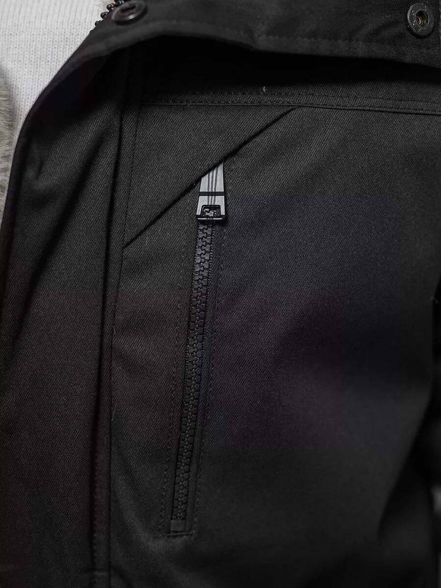 Men's winter jacket with a hood and fur. Zipper closure with pockets.