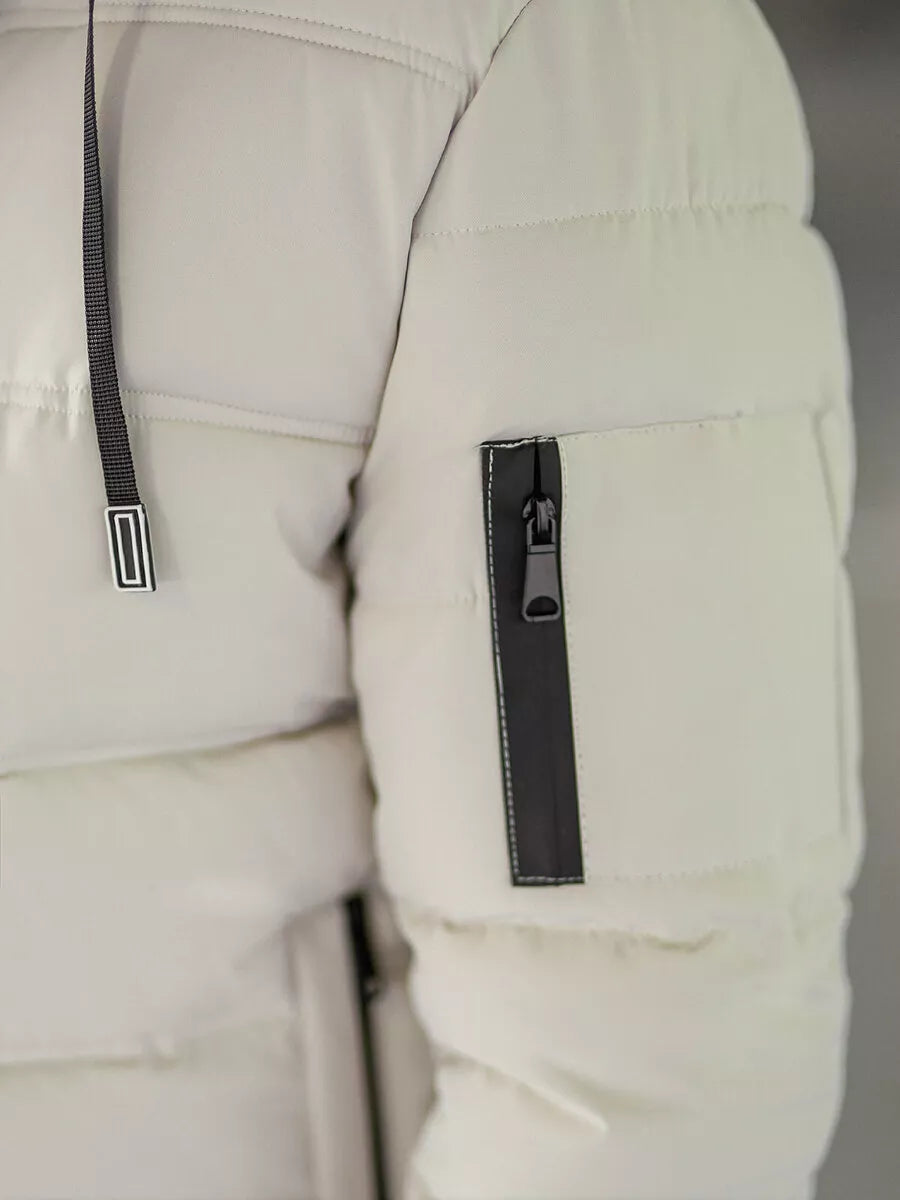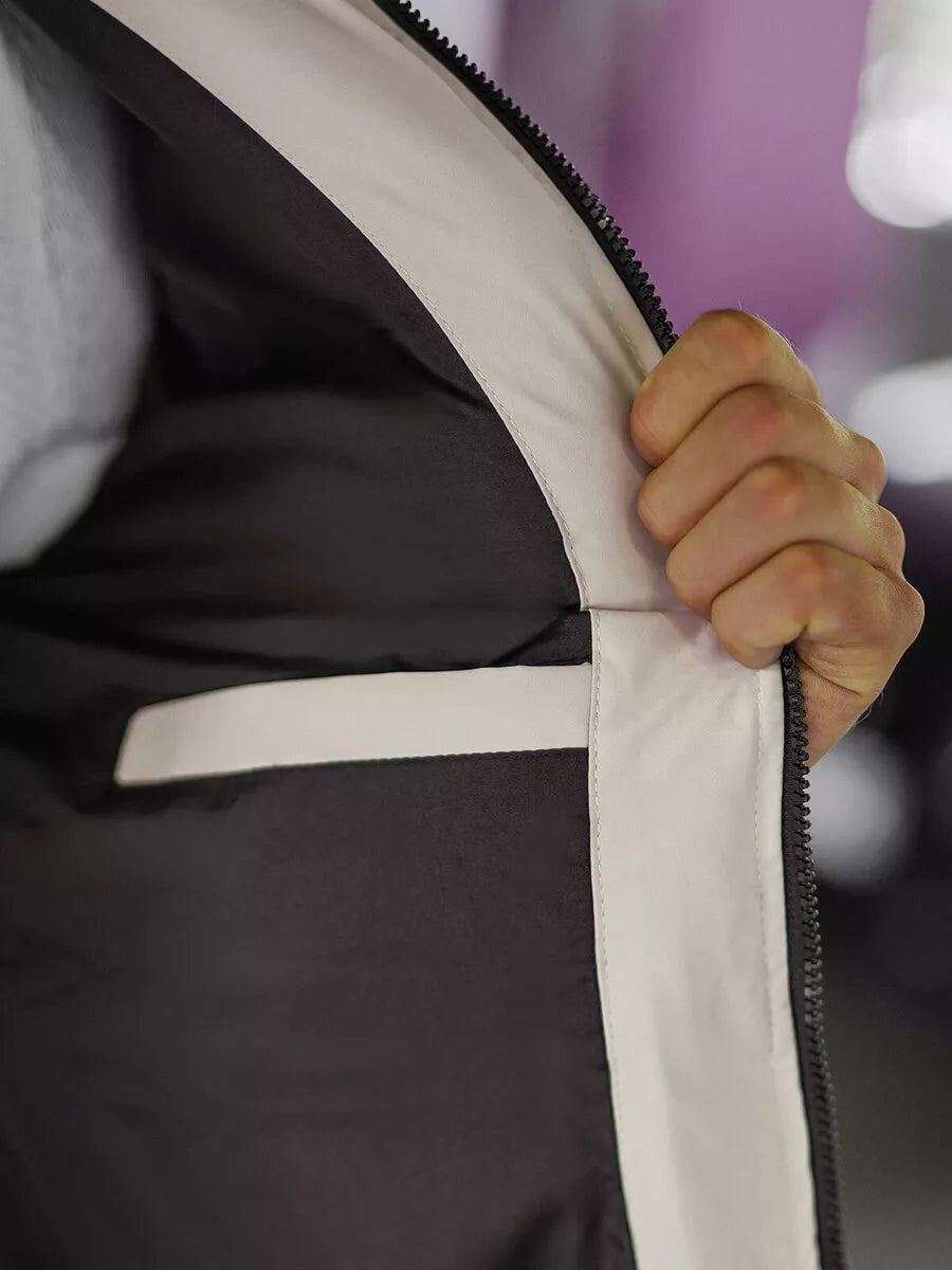 Men's quilted winter jacket. Zip closure, removable hood and stylish side pockets. High collar will help you feel warm in any weather.