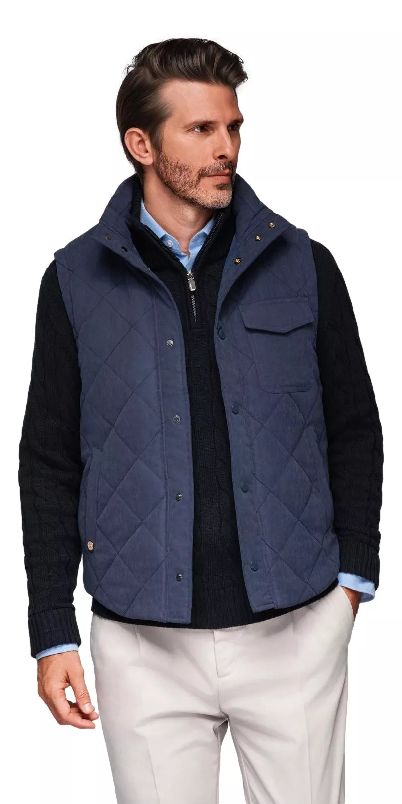 The vest is the perfect combination of classic and modern style. Thanks to its versatile shape and pleasant-to-the-touch fabric, it will suit both leisure and more casual outfits. The quilted structure, refined details and subtle branding give it a sophisticated look. It is a light yet practical layer for the transitional season. The vest is fastened with press studs, has a high collar, and has two pockets on the sides, one on the chest. Material: outer fabric: 85% polyester, 15% nylon lining: 100% polyester Model height: 185 cm. Model wears size S/M.
