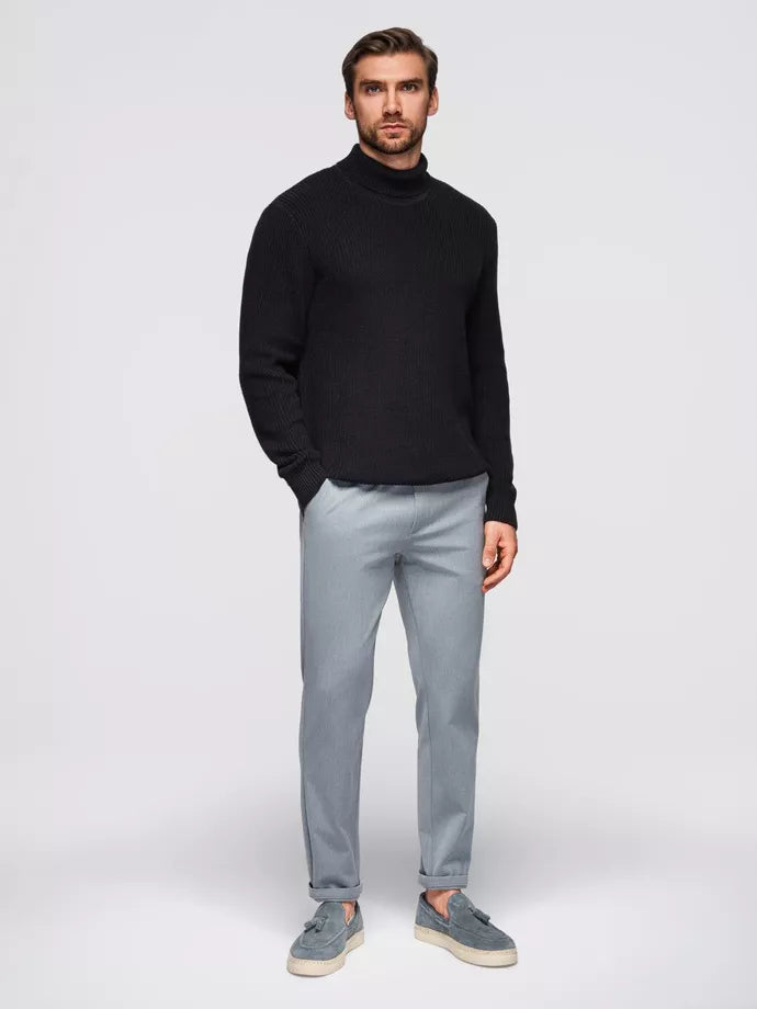 A timeless classic men's turtleneck sweater is a must-have for the fall-winter season. It is made of high-quality 100% cotton with a thicker ribbed weave, which ensures both thermal comfort and an elegant look. The regular cut fits the silhouette perfectly, while the ribbed cuffs and hem add functionality and class. A subtle metal clasp with the brand logo at the bottom emphasizes the unique character of the product. The turtleneck will be perfect for both the office and informal occasions.